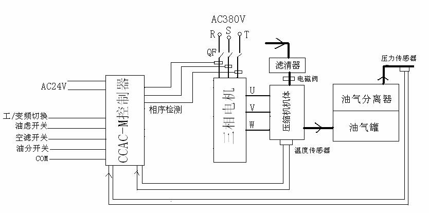 工頻頻驅(qū)動(dòng)方式下,壓力傳感器檢測(cè)空壓機(jī)出氣口排氣壓力,根據(jù)設(shè)定的“上限壓力設(shè)置”和“下限壓力設(shè)置”值進(jìn)行進(jìn)氣閥的開啟和關(guān)閉操作,使得出口壓力穩(wěn)定在“上限壓力設(shè)置”與“下限壓力設(shè)置”值之間。由于螺桿式壓縮機(jī)嚴(yán)格要求不允許反轉(zhuǎn),控制器會(huì)檢測(cè)引入空壓機(jī)系統(tǒng)的交流電源的相序,若有相序異常,將發(fā)出報(bào)警,使系統(tǒng)不能進(jìn)入運(yùn)行狀態(tài)。
