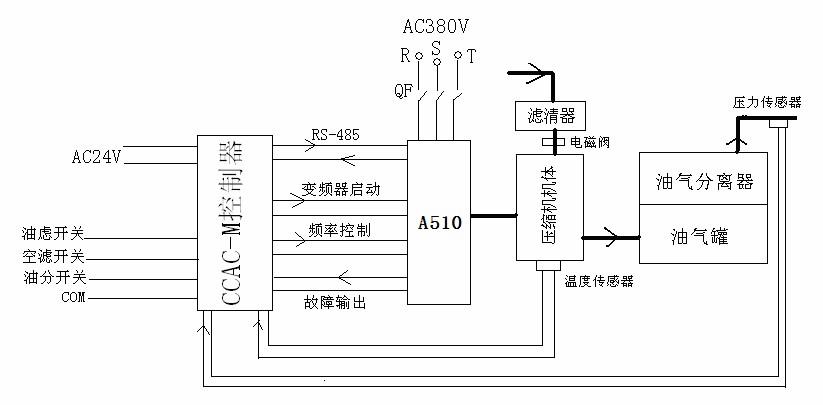 與變頻器組成空壓機(jī)控制系統(tǒng)時(shí),用戶可選用東元空壓機(jī)控制器CCAC,也可選用普樂特控制器(內(nèi)置東元變頻器驅(qū)動(dòng)),本文主要講述臺(tái)安空壓機(jī)控制器CCAC與東元A510變頻器組成的控制系統(tǒng)在螺桿式空壓機(jī)上的應(yīng)用。