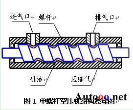 以單螺桿空壓機(jī)為例說(shuō)明空氣壓縮機(jī)工作原理,如圖1所示為單螺桿空氣壓縮機(jī)的結(jié)構(gòu)原理圖。螺桿式空氣壓縮機(jī)的工作過(guò)程分為吸氣、密封及輸送、壓縮、排氣四個(gè)過(guò)程。當(dāng)螺桿在殼體內(nèi)轉(zhuǎn)動(dòng)時(shí),螺桿與殼體的齒溝相互嚙合,空氣由進(jìn)氣口吸入,同時(shí)也吸入機(jī)油,由于齒溝嚙合面轉(zhuǎn)動(dòng)將吸入的油氣密封并向排氣口輸送;在輸送過(guò)程中齒溝嚙合間隙逐漸變小,油氣受到壓縮;當(dāng)齒溝嚙合面旋轉(zhuǎn)至殼體排氣口時(shí),較高壓力的油氣混合氣體排出機(jī)體。