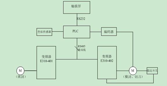 雙變頻立式包裝機由PLC+觸摸屏+2臺E310變頻器+編碼器+色標傳感器及繼電器組成電控系統(tǒng);溫控電路由智能型溫控表、固態(tài)繼電器、熱電偶元件等組成,控溫精確,顯示直觀,設(shè)定方便;機械部分包括包裝薄膜、初級導向輥筒、橡膠輥筒、導向輥筒、薄膜導向器、灌裝填充物、縱向熱封口輥筒、橫向熱封口輥筒、橫向冷卻封口輥筒、切口裝置、分袋切割裝置、成品輸出裝置等。