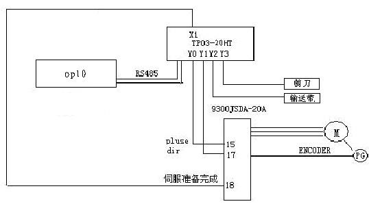 切紙機(jī)械是印刷和包裝行業(yè)常用的設(shè)備之一。切紙機(jī)完成的基本動(dòng)作是把待裁切的材料送到指定位置,然后進(jìn)行裁切。其控制的核心是一個(gè)單軸定位控制。目前國(guó)內(nèi)進(jìn)行切紙?jiān)O(shè)備進(jìn)給定位系統(tǒng)主要有兩種方式,一是利用PLC結(jié)合變頻器實(shí)現(xiàn),一是利用PLC結(jié)合伺服系統(tǒng)實(shí)現(xiàn),從效率上來(lái)說(shuō)伺服相對(duì)變頻器要高很多。這次我們結(jié)合客戶設(shè)備的特點(diǎn)提出了一套方案,文本(OP10+PLCTP03-20HT+伺服(JSDE-20A)進(jìn)行裁切參數(shù)設(shè)定和完成一些手動(dòng)動(dòng)作。