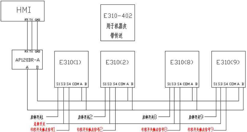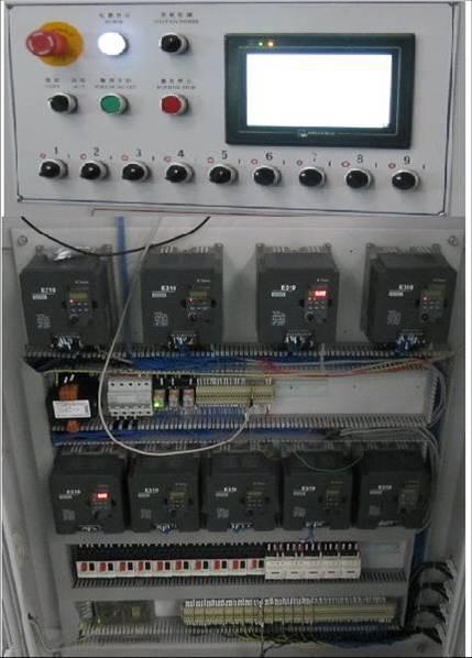 系統(tǒng)組成:臺安AH系列觸摸屏+AP100系列PLC+E310系列變頻器(1臺1.5kw,9臺2.2kw)